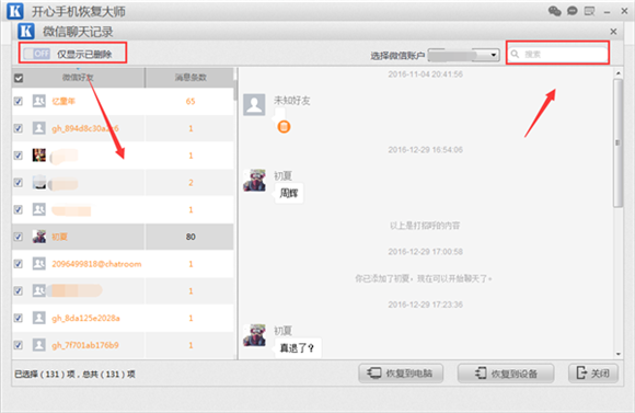 第四步:點擊之後,軟件就立即進入到了掃描和分析的階段,開心手機恢復大師將會對手機中的微信通訊錄和微信聊天記錄等數進行掃描分析,過程大概需要3-5分鐘,掃描結束之後,微信聊天記錄預覽界面就會出現了,我們可以自行搜索查看;