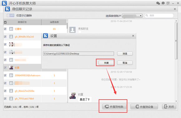 第五步:找到想要查看的微信聊天記錄之後,我們就可以直接在前面的方框中勾選,然後點擊下面的“恢復到電腦”的按鈕了,這樣就可以將這部分微信記錄給恢復到電腦上進行保存了。