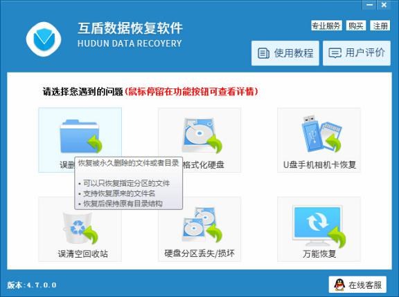 2、運行互盾數據恢復軟件(http://www.cjxz.com/softs/52336.html),我們點擊軟件界面的“誤刪除文件”按鈕,該功能能夠恢復我們刪除的文件。
