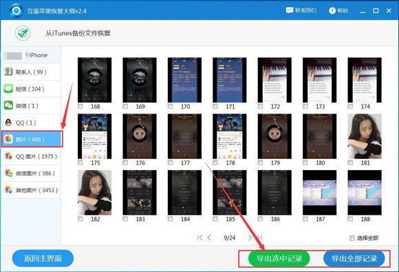 4、等待軟件對我們手機的數據掃描完成以後,我們點擊“圖片”就可查看手機刪除的照片了,勾選出我們想要恢復的手機照片,點擊“導出選中記錄”將照片保存到電腦上。