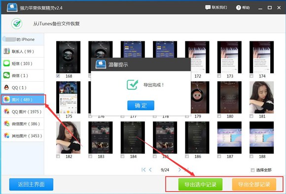 4、軟件對手機數據掃描完成後,我們就可以點擊“圖片”選項,然後在軟件的界面當中查看手機裡的數據。勾選出我們想要恢復的照片,點擊“導出選中記錄”即可將照片保存到電腦上。