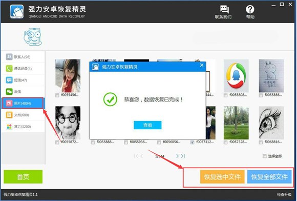 5、軟件對手機數據掃描完成以後,我們點擊“照片”選項,即可在軟件的界面查看手機裡的照片,勾選出我們誤刪的照片,點擊“恢復選中文件”就可以將照片保存在電腦上。