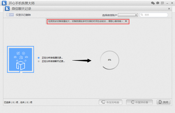 第四步:然後開心手機恢復大師開始深度掃描分析蘋果手機中的微信聊天記錄數據。此過程是找回微信刪除的聊天記錄最重要的一個步驟,此階段保持蘋果手機與電腦的持續連接,並且不再操作手機。此過程需要5-10分鐘,耐心等待。