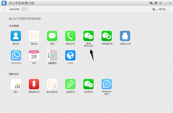 第三步:點擊“開始”後,跳轉到數據恢復主界面。在數據恢復主界面我們可以看到支持恢復的蘋果手機數據類型有很多:通訊錄、短信、備忘錄、微信聊天記錄、照片等共計17種。怎麼找回微信刪除的聊天記錄?我們點擊“微信聊天記錄”圖標即可。
