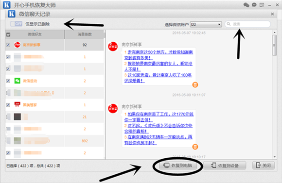 第五步:掃描完成後,進入到微信聊天記錄預覽界面。掃描出來的微信聊天記錄以兩種顏色區分顯示:黑色的表示蘋果手機中還存在的微信聊天記錄;黃色的表示蘋果手機中刪除的微信聊天記錄。如何找回微信刪除的聊天記錄?我們首先要篩選出我們要恢復的微信聊天記錄:點擊“僅顯示已刪除”或搜索關鍵字查找微信聊天記錄。然後在對應微信聊天記錄的左側方框前勾選,點擊“恢復到電腦”即可恢復刪除的微信聊天記錄保存到電腦上。