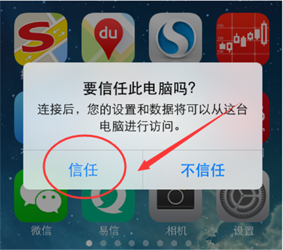 第二步: 將你的蘋果手機連接到電腦上,如果是第一次連接的話,需要在手機提示框中點擊信任按鈕來信任此電腦;