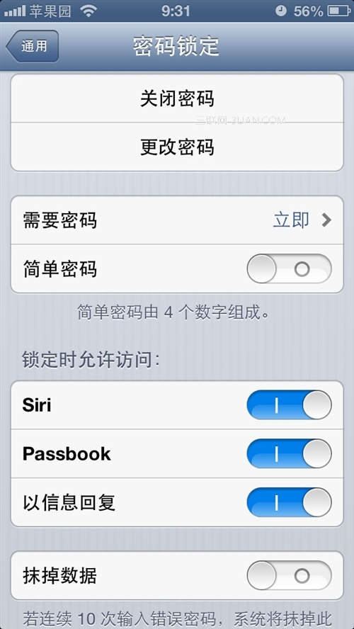 第7步:密碼設置完畢後立即生效,用記在該設置中還可以關閉密碼、更改密碼。還可以設置鎖定時允許訪問的程序,甚至還有一招更狠的:抹掉數據!用戶輸入密碼十次後,系統將抹掉該手機中的數據。對於手機遺失,該功能不失為避免數據被竊的最佳方案 ;