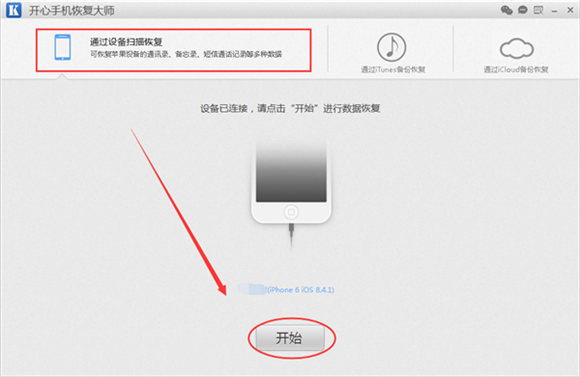 第二步:安裝完成,直接運行開心手機恢復大師,在軟件的主界面,我們選擇三種恢復模式中的第一模式“通過設備掃描恢復”,然後將蘋果手機連接到電腦上,連接成功之後,我們就可以直接點擊下方的“開始”按鈕繼續了;