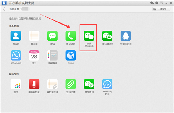 第三步:點擊“開始”之後,軟件就進入到了數據恢復模式,我們可以看到的數據項圖標有十幾種,今天我們只需要找到想要恢復的“微信聊天記錄”圖標進行點擊即可;