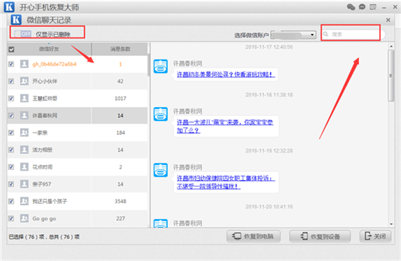 第四步:點擊之後,軟件就立即進入到了掃描和分析的階段,開心手機恢復大師將會對手機中的微信通訊錄和微信聊天記錄等數進行掃描分析,過程大概需要3-5分鐘,掃描結束之後,微信聊天記錄預覽界面就會出現了,我們可以自行搜索查看;