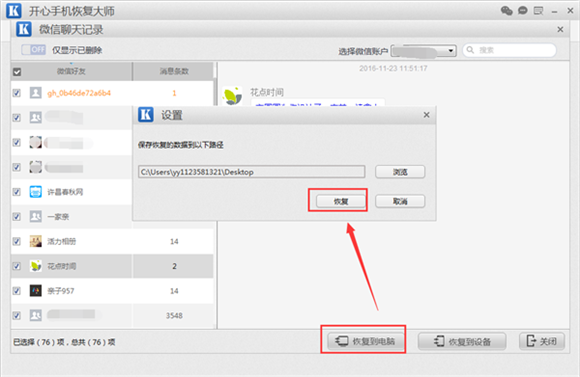 第五步:找到想要恢復的微信聊天記錄之後,我們就可以直接在前面的方框中勾選,然後點擊下面的“恢復到電腦”的按鈕了,這樣就可以將這部分微信記錄給恢復到電腦上進行保存了。