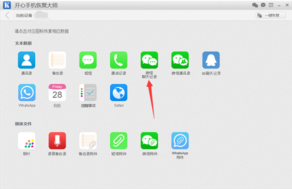 三、點擊“開始”後,跳轉到恢復數據的主界面。我們可以看到,開心手機恢復大師可以支持恢復的數據類型多達17種,除了微信聊天記錄,QQ聊天記錄、備忘錄、通訊錄、照片、短信等均支持恢復。怎麼能把微信刪除的聊天記錄找到?我們點擊“微信聊天記錄”,然後軟件開始掃描iPhone的微信聊天記錄。