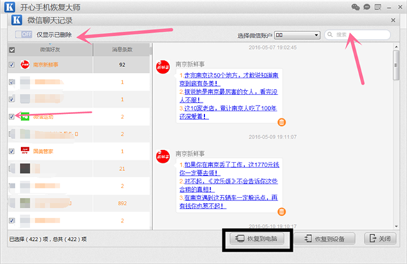 五、 這時候我們就可以自主的篩選、搜索(點擊“僅顯示已刪除”、或搜索關鍵詞)自己想恢復的微信聊天記錄。左側方框中對應勾選,然後點擊界面下方的“恢復到電腦”,就可以將選中刪除的微信聊天記錄恢復了。