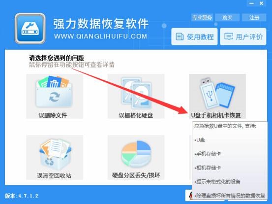 1.請雙擊打開強力數據恢復軟件:http://www.qianglihuifu.com/,在軟件主界面的六宮格中選擇你遇到的問題,顯然我們是要恢復手機數據,請選擇“U盤手機相機卡恢復”,點擊進入。