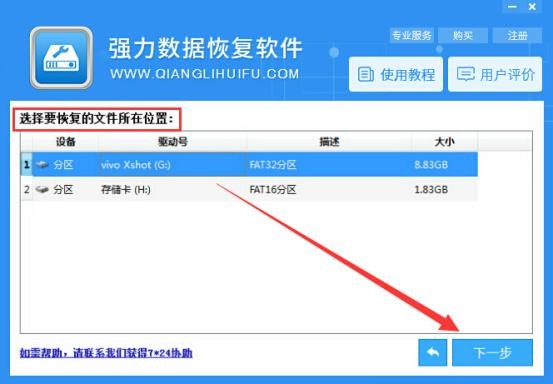 2.這時候可以在軟件界面中看見手機的儲存分區列表,請選擇手機刪除照片所在的分區,鼠標選中後,點擊“下一步”按鈕。