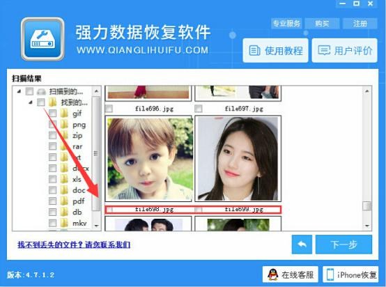 4.在掃描結果中選擇要恢復手機照片,可以打開相應的圖片格式文件夾,預覽手機照片文件,在要恢復的文件前勾選後,點擊“下一步”。