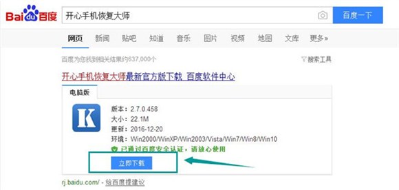 步驟二、恢復已刪除的微信聊天記錄之前,還需要將開心手機恢復大師下載到電腦上,直接百度“開心手機恢復大師”點擊“立即下載”就可以安裝了;