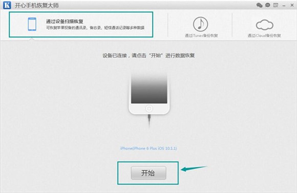步驟三、下載完成運行軟件,即可看到軟件處於默認的第一模式【通過設備掃描恢復】,當軟件識別到設備之後,即可看到主界面上顯示的“設備已連接”,點擊【開始】進入微信聊天記錄恢復模式;
