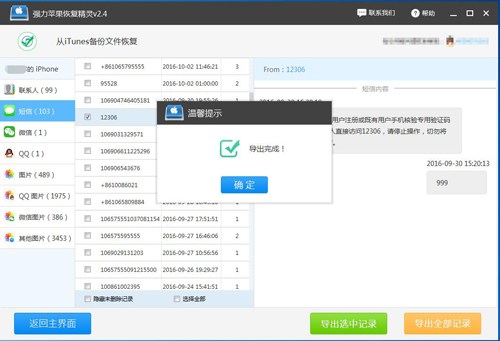 2、運行強力蘋果恢復精靈(蘋果恢復精靈),我們點擊選擇“從iPhone設備掃描恢復”或者“從iTunes備份文件恢復”,下面我就以“從iTunes備份文件恢復”模式為例,教大家蘋果手機刪除的短信怎麼恢復。
