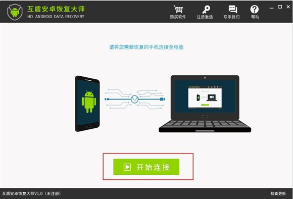 3、運行互盾安卓恢復大師,我們點擊軟件界面的“開始連接”選項,軟件就會自動連接安卓手機。
