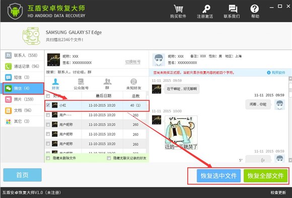 6、掃描完成之後,我們點擊“微信”選項,在軟件界面查看微信聊天記錄,然後吧自己想要恢復的微信聊天記錄勾選出來,點擊“恢復選中文件”進行恢復。