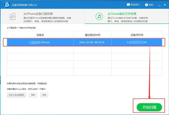 2、下載完成後,我們將蘋果手機連接電腦,然後利用iTunes軟件成功備份蘋果手機裡的數據。備份成功之後,運行互盾蘋果恢復大師,點擊“從iTunes備份文件恢復”軟件會自動檢測到已備份的手機數據。只要我們點擊“開始掃描”按鈕,軟件就會開始對備份數據進行深度掃描了。