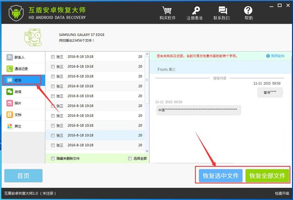 5、等待軟件掃描完成後,我們可以點擊“短信”選項,然後在軟件的右側查看手機短信,勾選出想要恢復的短信後,點擊“恢復選中文件”保存短信。