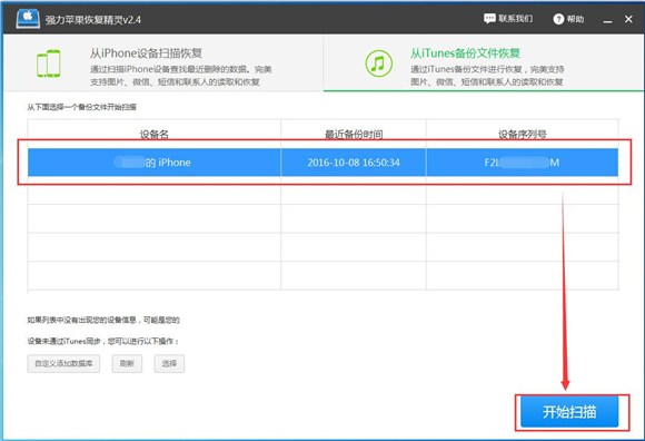 3、運行強力蘋果恢復精靈,我們點擊界面的“從iTunes備份文件恢復”,這時候軟件會自動檢測出已備份的數據,並在界面顯示出相應信息,我們點擊右下角的“開始連接”按鈕,軟件就會自動開始掃描了。