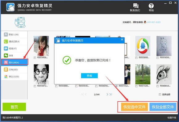 6、等待強力安卓恢復精靈掃描完成後,我們點擊“照片”可查看手機裡的照片,將需要恢復的照片勾選出來,點擊“恢復選中文件”對照片進行恢復。