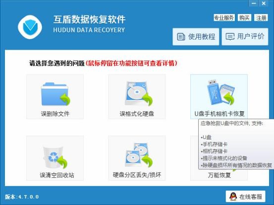 選擇恢復模式:啟動互盾數據恢復軟件(http://www.huifutz.com/),軟件有多種不同的恢復模式,可以針對性恢復數據,手機數據恢復請選擇和手機相關的“U盤手機相機卡恢復”功能,鼠標放在上面可以查看詳情,請點擊進入。