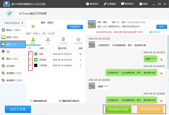 接下來在電腦上借助強力蘋果恢復精靈軟件來讀取備份數據,提取出微信聊天記錄即可。