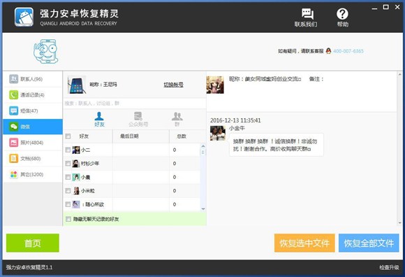 5、此時,強力安卓恢復精靈對安卓手機數據進行掃描,我們在軟件界面可以看到手機照片、手機短信、手機通訊錄等等。