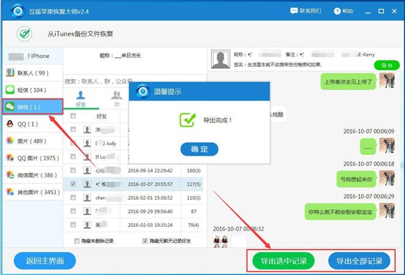 4、等待軟件掃描完成之後,我們需要點擊“微信”選項,才可以觀看手機裡的聊天記錄,將那些需要花恢復的聊天記錄勾選出來,點擊“導出選中記錄”就可以將聊天記錄進行保存了。