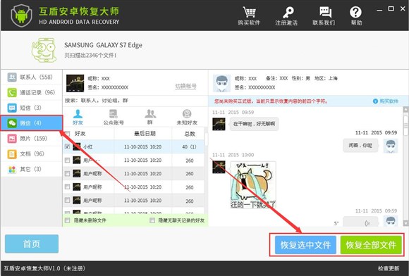 5、等待軟件掃描完成之後,我們可以點擊“微信”查看安卓手機裡的微信聊天記錄。將需要恢復的聊天記錄勾選出來,點擊“恢復選中文件就可以將刪除的微信聊天記錄進行恢復了。