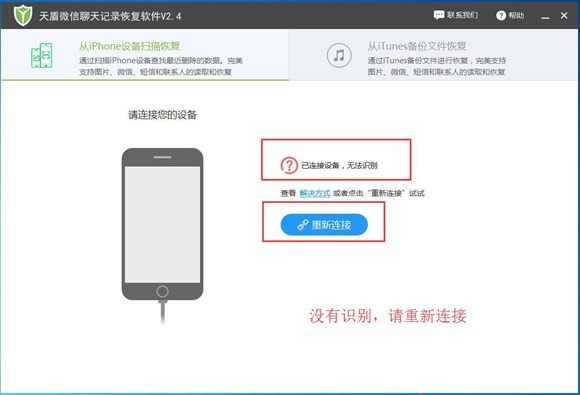 3、蘋果手機與電腦連接後,運行天盾微信聊天記錄恢復軟件,也會自動檢測到手機,在界面可以看到手機相關信息。我們選擇“從iTunes備份文件恢復”來幫助解決怎麼恢復微信刪除的記錄教程操作的進行。