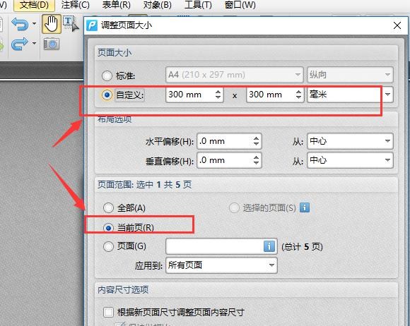 5、彈出來的窗口,我們可以設置調整頁面的大小,可以看到,這張頁面大小是自定義的,我們可以在自定義的框子裡設置與其他PDF頁面一樣的數字大小。