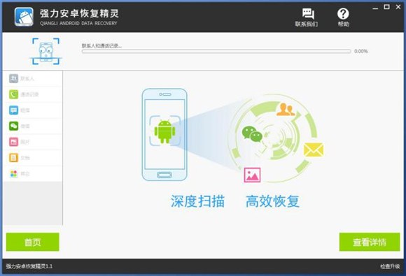2、然後將安卓手機連接到電腦,並打開強力安卓恢復大師,點擊界面的“開始連接”按鈕,軟件檢測到安卓手機識別出手機並進行連接。