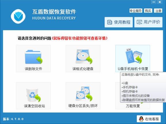 2、打開互盾數據恢復軟件(http://www.cjxz.com/softs/52336.html ),此時我們會發現互盾數據恢復軟件有多種數據恢復模式可供選擇,因為我們需要恢復的是U盤丟失文件,所有點擊“U盤手機相機卡恢復”。