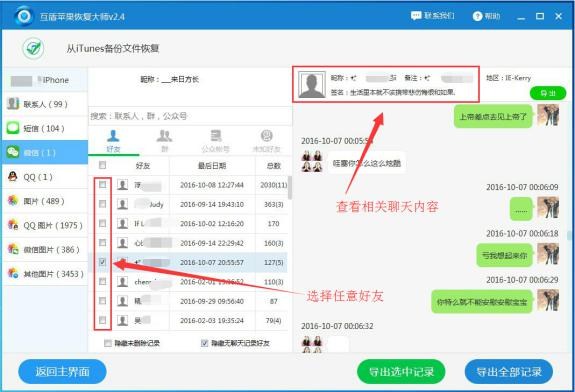 4、掃描完成後我們可以看見軟件左側有“微信”選項,點擊“微信”選項,即可查看裡面的聊天記錄,然後選擇出那些自己想要恢復的聊天記錄,點擊“導出選中記錄”就可以保存聊天記錄了。http://www.huifudashi.com/678.html