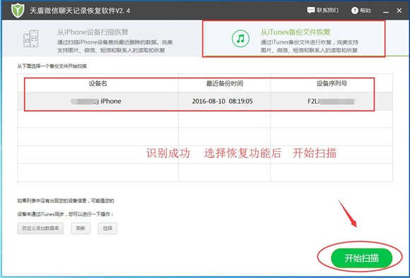 2、將iPhone設備連接到電腦上,打開天盾微信聊天記錄恢復軟件,天盾微信聊天記錄恢復軟件會自動檢測並連接設備。 成功連接後,點擊“從iTunes備份文件恢復”,還有“開始掃描”。