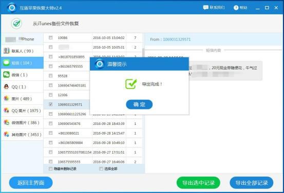 第二步:靜待文件掃描結束,在軟件的左側選擇“短信”查看具體的短信內容,勾選要恢復的手機短信,然後點擊“導出選中記錄”就可以恢復蘋果手機刪除的短信了,是不是非常的簡單呢?