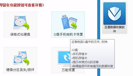 第二步:我們可以在軟件界面中看見六種數據恢復功能,請用戶選擇相應的恢復功能進行恢復操作,安卓手機短信刪除恢復請選擇“U盤手機相機卡恢復”功能,鼠標點擊進入功能界面。