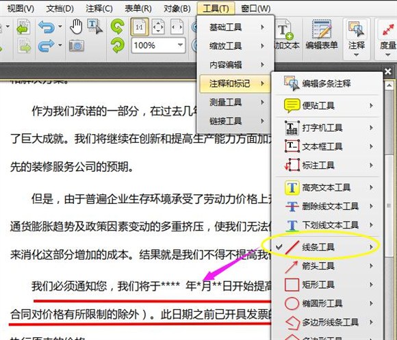 3、在頂部的工具欄目裡,“注釋和標記”功能可以調整線條粗細,通過截圖也可以看到這裡的“線條工具”