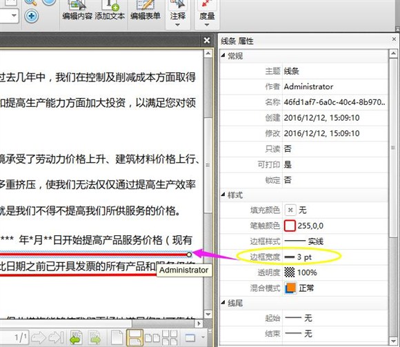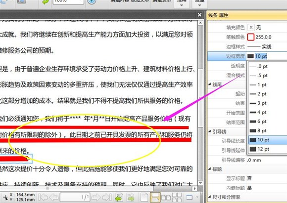 4、通過界面可以看到,我打開的PDF文件裡有一處有線條標記,下面,我們就對該處的線條進行調整演示操作。點擊文字下的線條後,右邊就會出現線條屬性,我們就可以通過對該線條屬性的設置來調整PDF線條粗細。