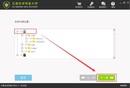 3.此時互盾安卓恢復大師(下載地址:http://www.cjxz.com/softs/70460.html)將會自動連接安卓設備,請點擊進入下一步。軟件界面將會出現兩個儲存空間,請選擇刪除的照片所在空間,然後點擊“下一步”進入文件掃描狀態。