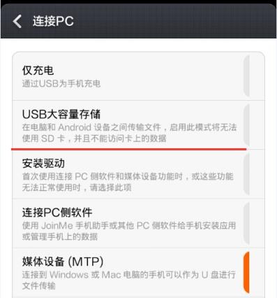 2.如果你已經打開了USB調試,手機連接電腦後將會出現一個USB設置窗口,請選擇儲存模式或是大容量儲存模式等。