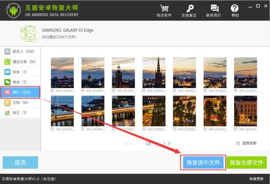 4.請等待文件掃描結果,然後選擇“照片”選項,接著我們就可以看見想要的手機照片文件,請在要恢復的手機照片文件前面的方框中打鉤,然後點擊“恢復選中文件”即可恢復安卓手機刪除的照片。