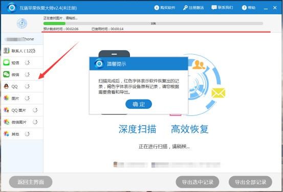 3.此時互盾蘋果恢復大師將會進文件掃描狀態,我們可以看見軟件的掃描進度,當掃描進度到100%後就可以看見恢復的數據了。