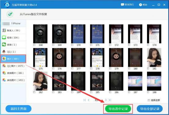 4.在文件掃描結果界面中,選擇“照片”選項,接著我們就可以看見想要的手機照片文件,請在要恢復的手機照片文件前面的方框中打鉤,然後點擊“導出選擇記錄”即可恢復安卓手機刪除的照片。