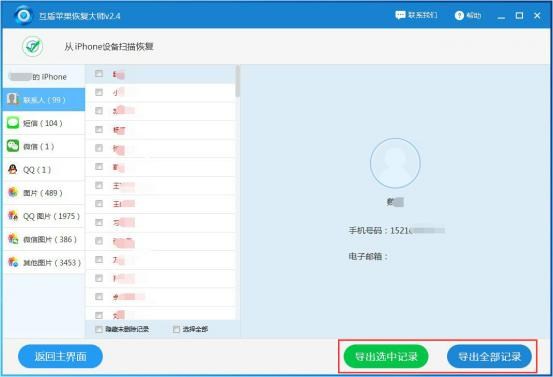 3.請等待互盾蘋果恢復大師進行相應的掃描工作,當文件掃描結果出來後,請在左側選擇“聯系人”,這時候點擊“導出全部記錄”就可以將這些蘋果手機通訊錄導出復制到電腦上了。用戶也可以勾選要導出備份的聯系人,點擊“導出選中記錄”。